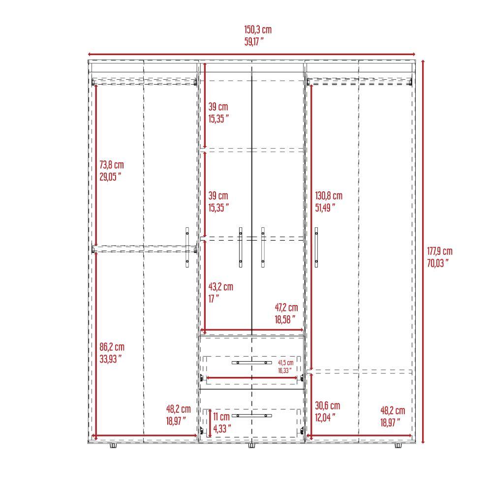 Closet, con 4 puertas batientes, 2 cajones deslizables, 3 tubos pata colgar ropa y amplios espacios de guardado.