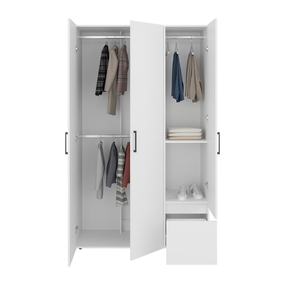 Closet, con 3 puertas abatibles, 1 cajón multiusos, tubos para colgar ropa, 2 entrepaños divisores, facil de ensamblar e instalar.