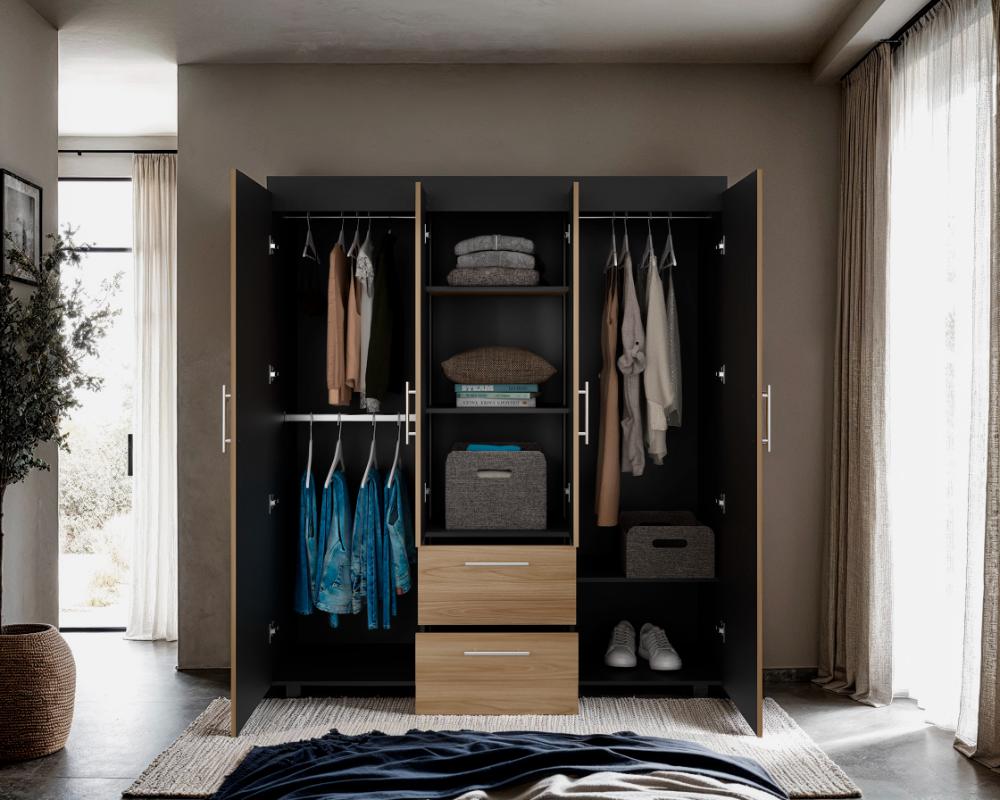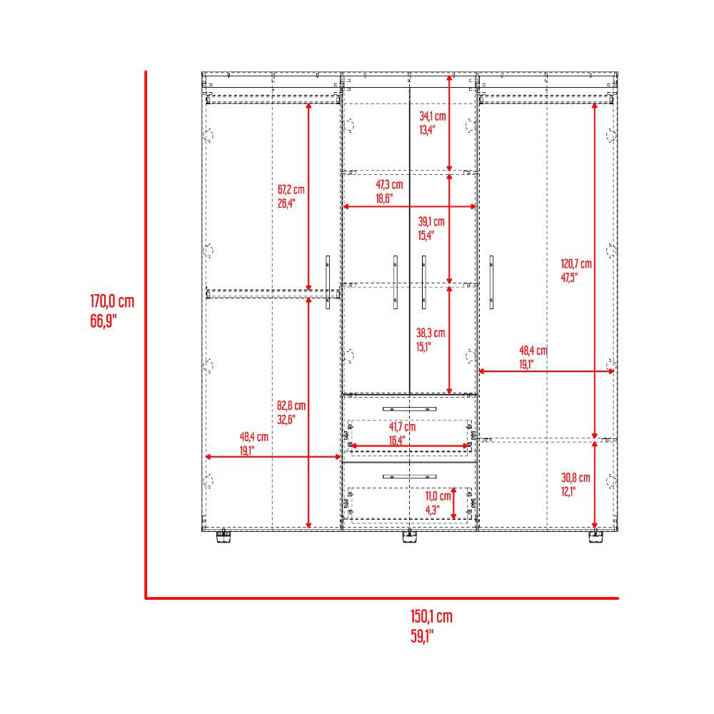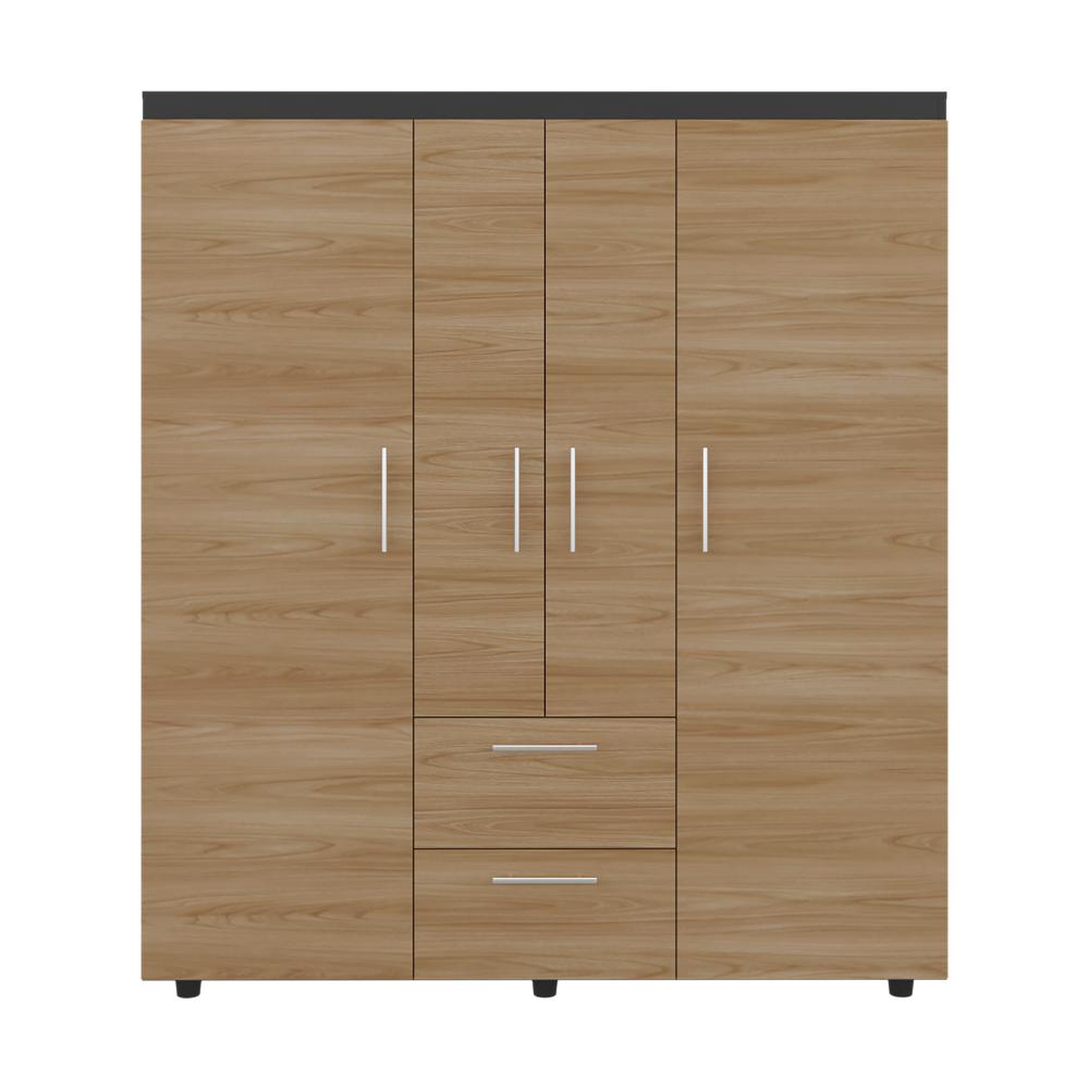 Closet, con 4 puertas batientes, 2 cajones deslizables, 3 tubos pata colgar ropa y amplios espacios de guardado.