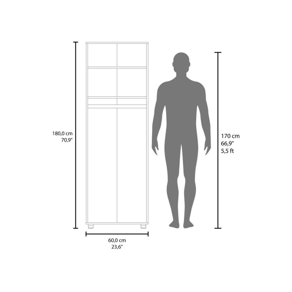 Closet, con 2 puertas abatibles, 2 tubos para colgar prendas, y 3 entrepaños para organizar.