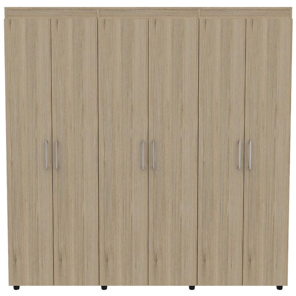 Closet, con amplios espacios para organizar, diseño funcional con seis puertas abatibles y dos cajones, multiusos con correderas metálicas, tubos para colgar y ordenar ropa, manijas metálicas.