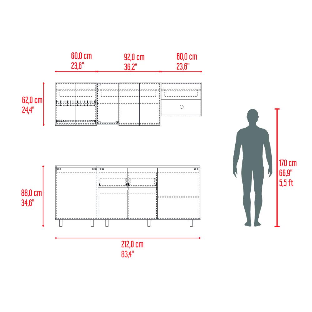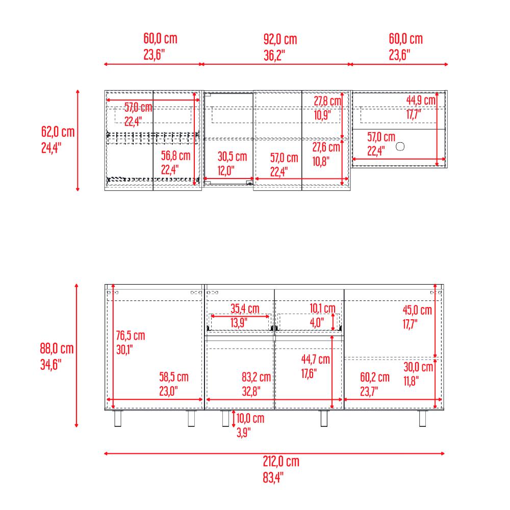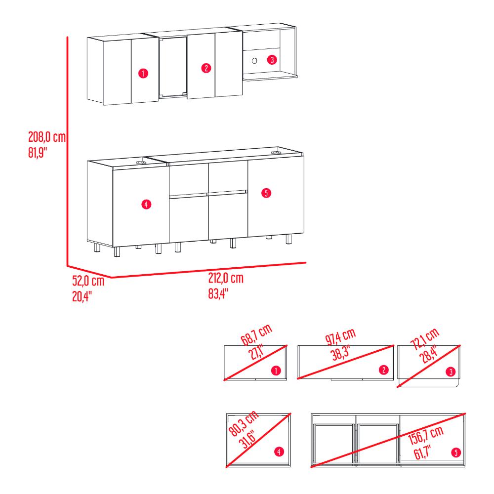 Cocina Integral, con espacio para almacenar alimento y otros objetos, en el mueble superior cuenta con 4 puertas abtibles, espacio para campana extractora de 60 cm, espacio para microondas, incluye posuelo y portavasos, mueble inferior con 4 puertas abatibles, 2 cajones, sirve para meson izquiero negras. *NO INCLUYE MESÓN*