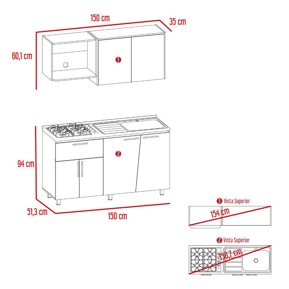 Cocina Integral, con dos puertas abatibles, incluye locero y portavasos, espacio para alimentos utensilios de cocina y decorativos, modulo independiente para campana extractora, el modulo inferior cuenta con 4 puertas abatibles, 1 cajón, patas metálicas negras, con amplio espacio para guardar alimentos, electrodomésticos u otros. *INCLUYE MESÓN*