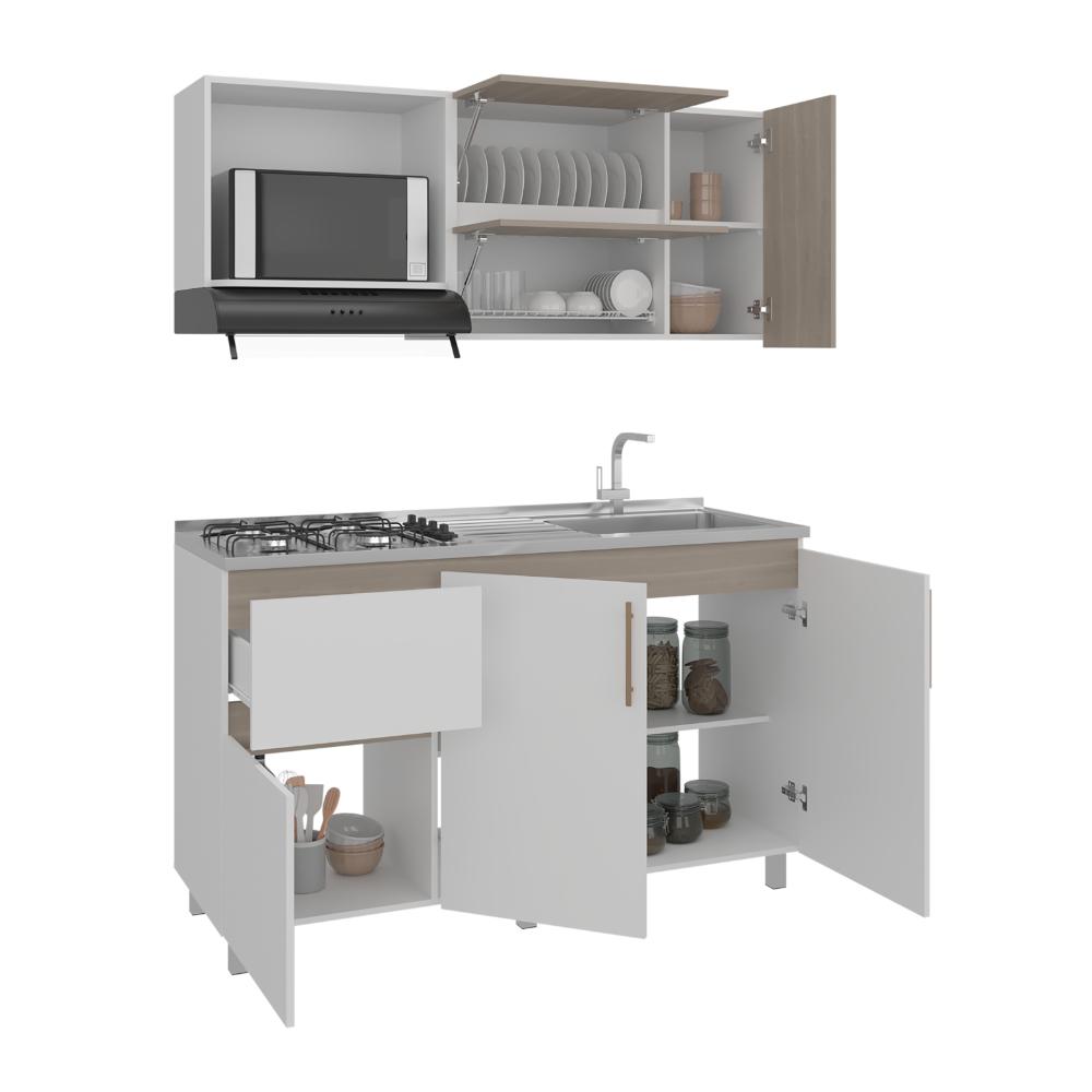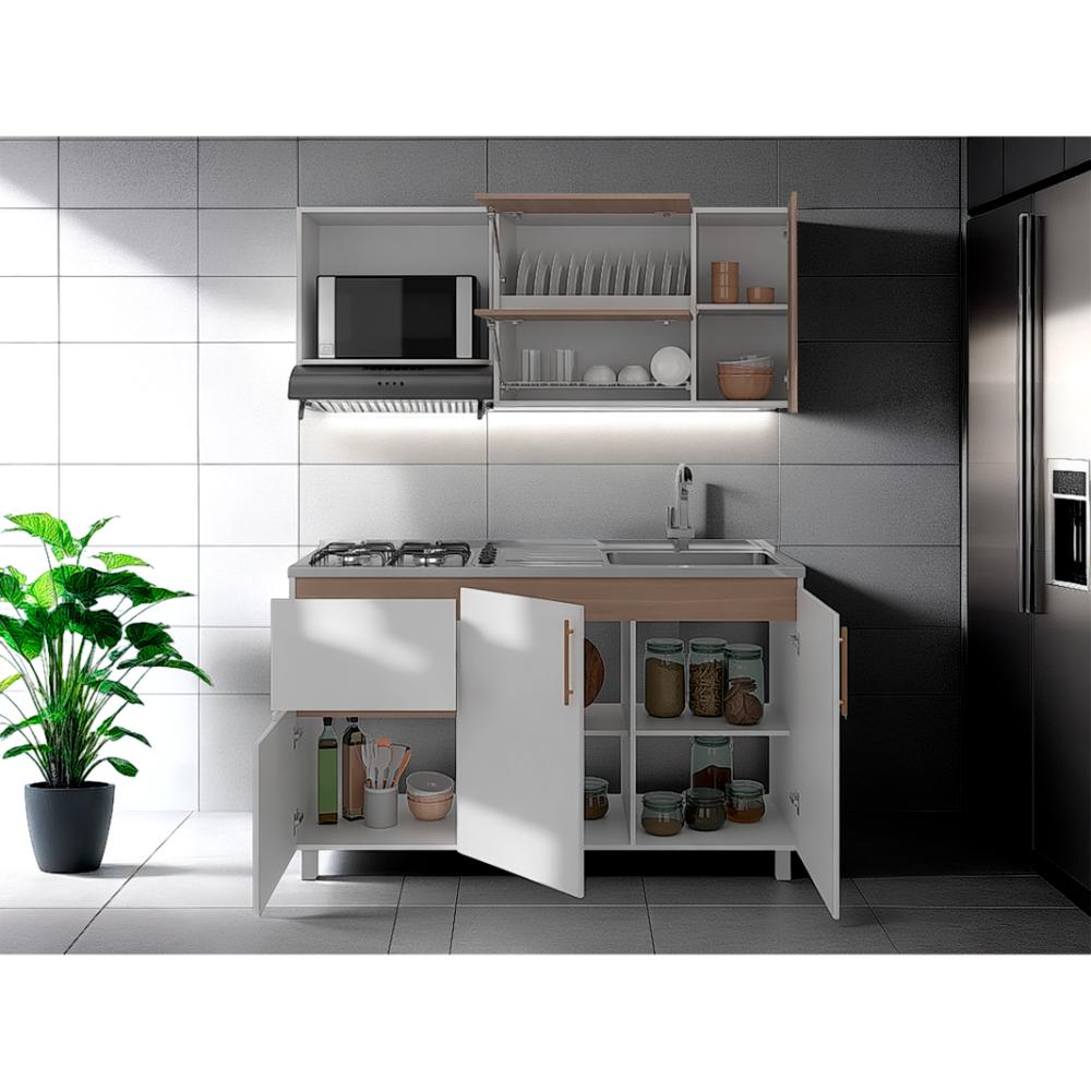 Cocina Integral, con modulo superior con 3 puertas abatibles, incluye locero y vasera, cuenta con espacio para almacenar alimentos y espacio para campana y microondas, en el modulo inferior cuenta con 3 puertas abatibles, 1 cajón, manijas, patas metálicas e incluye mesón derecho. *INCLUYE MESÓN*