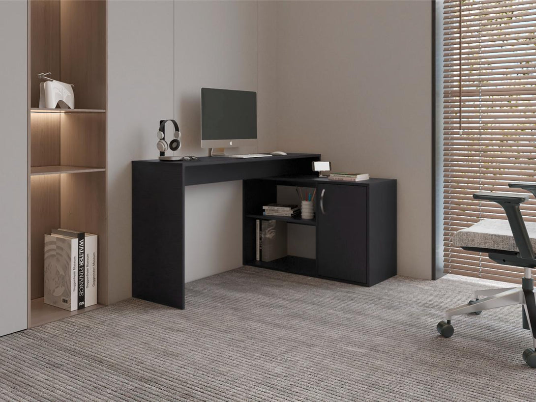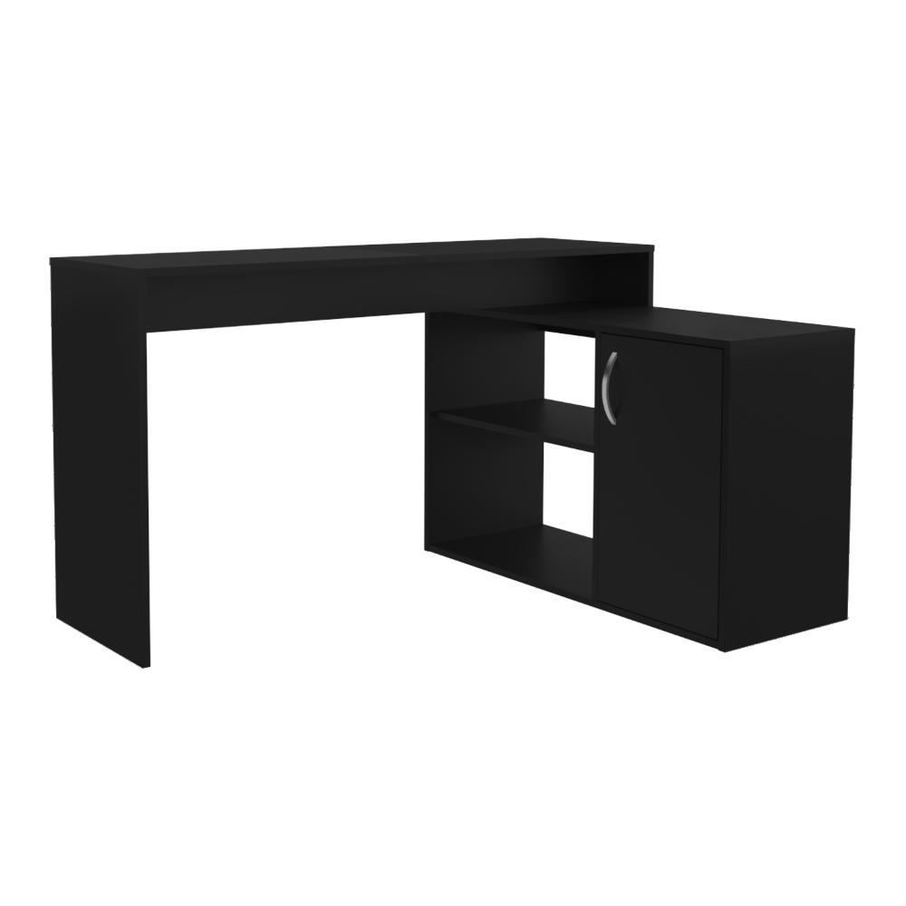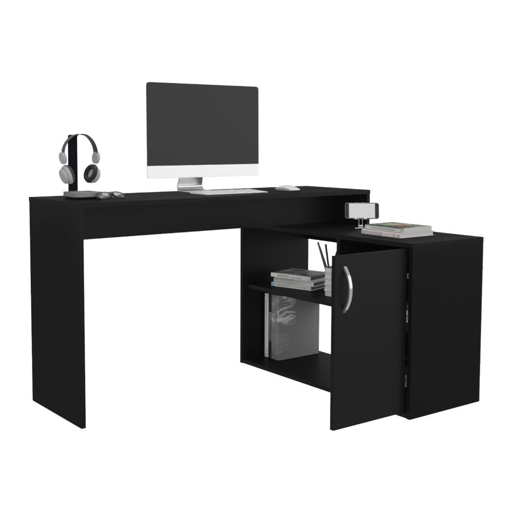 Escritorio en L, con puerta batiente para almacenar libros y otros, compartimentos para objetos decorativos