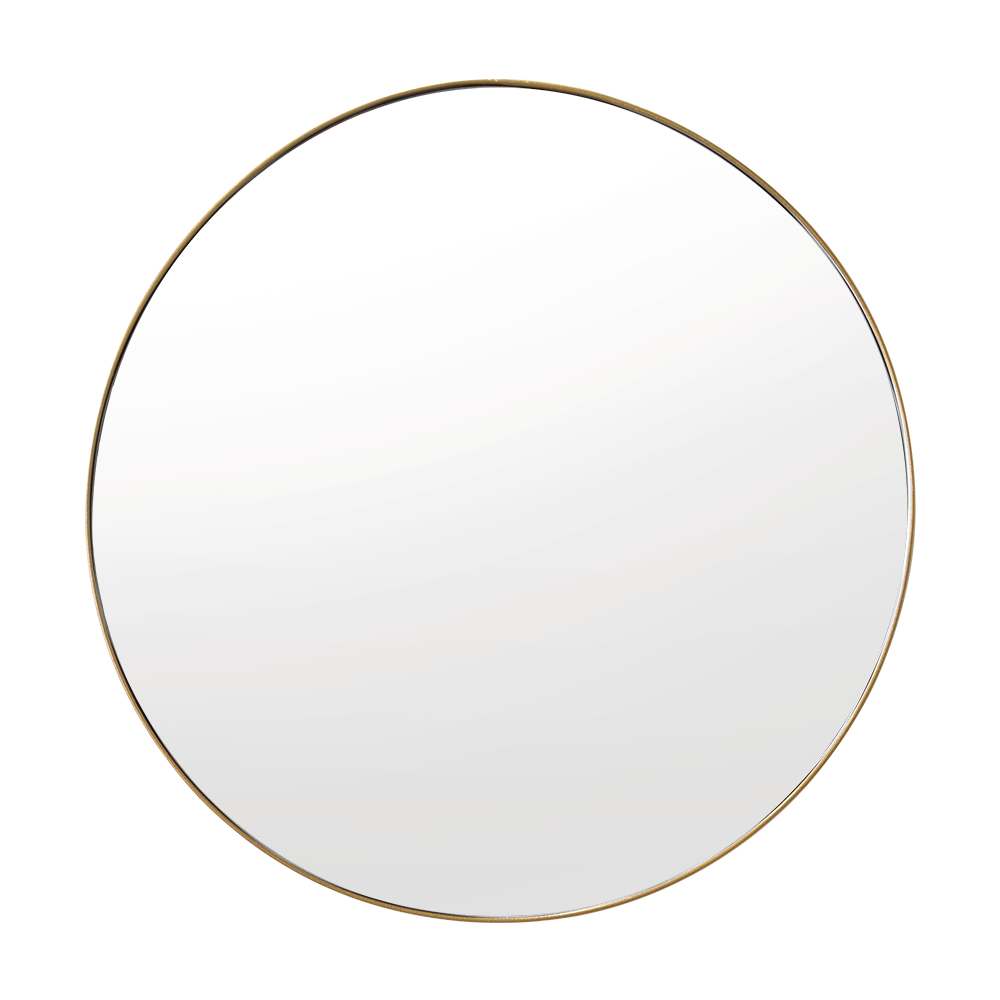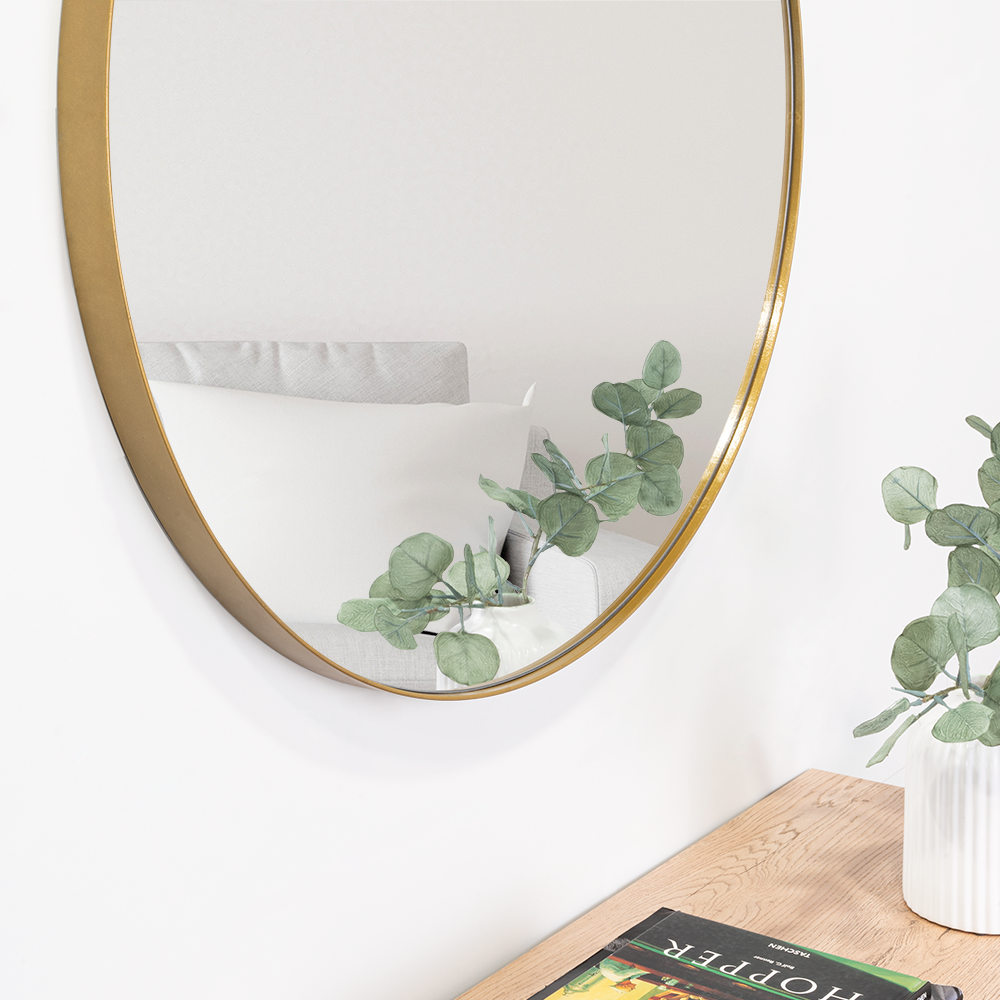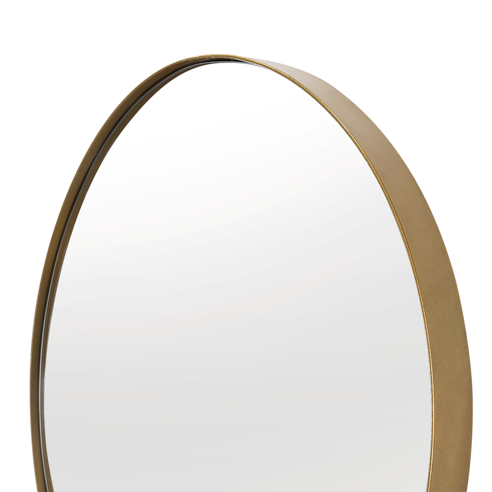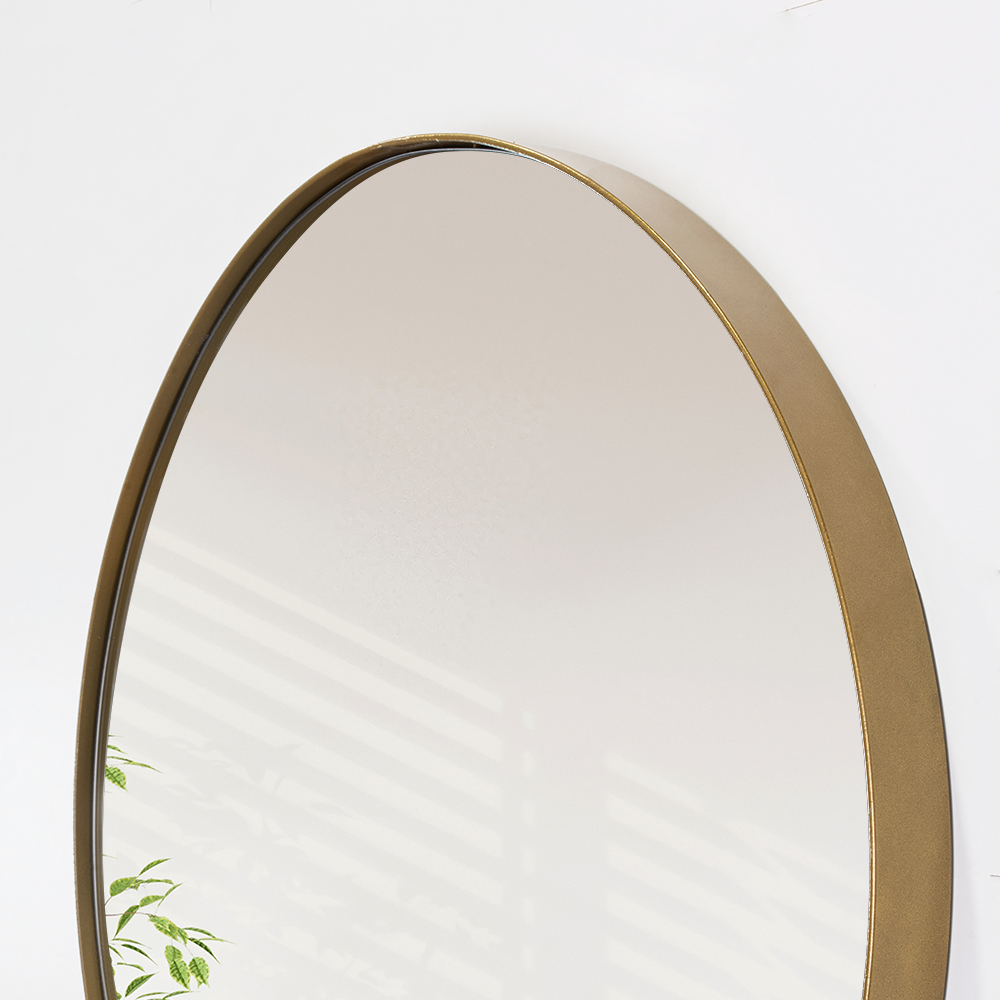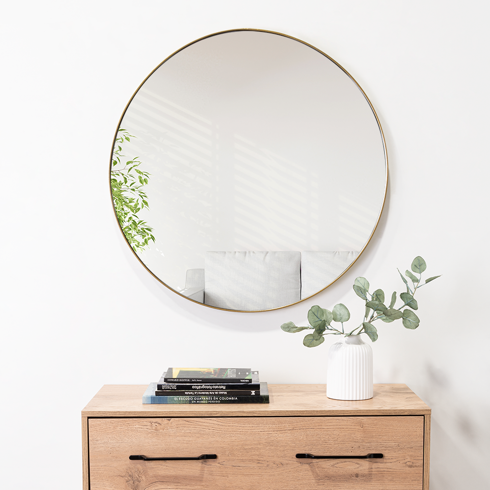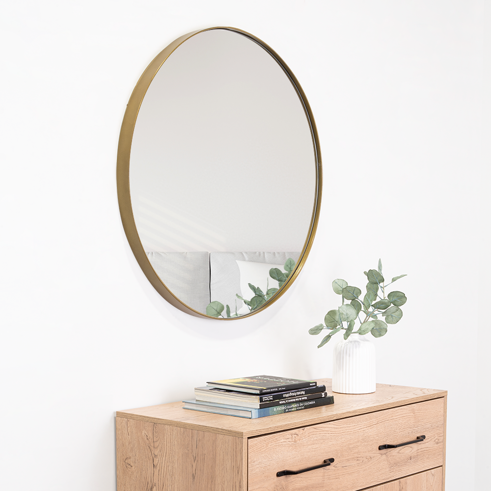 Espejo circular con marco metálico color dorado, ensamble a pared con chaflan