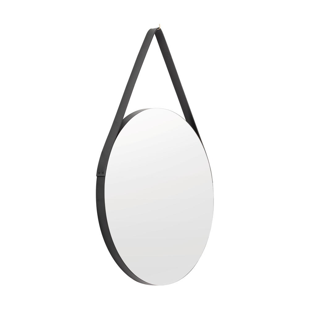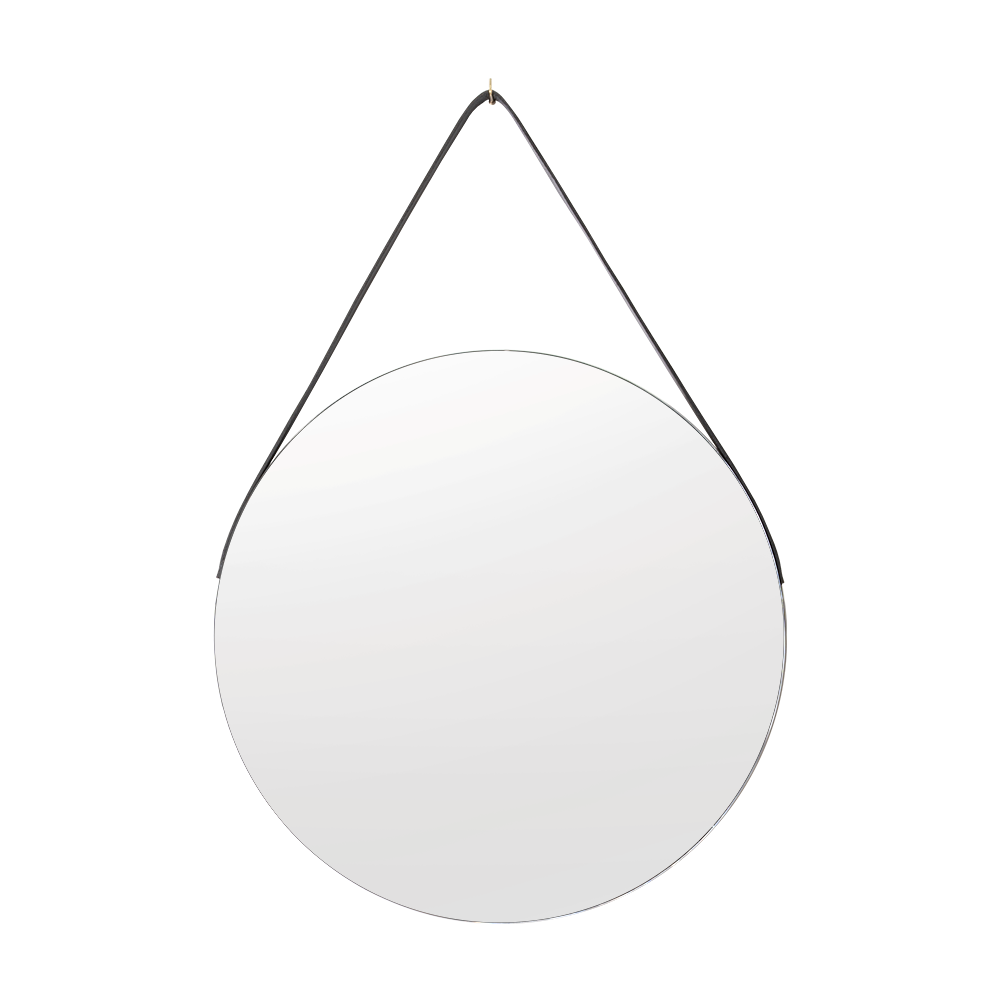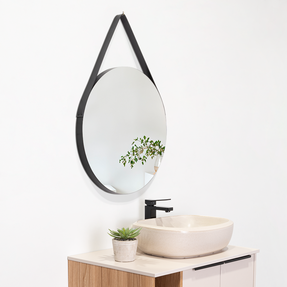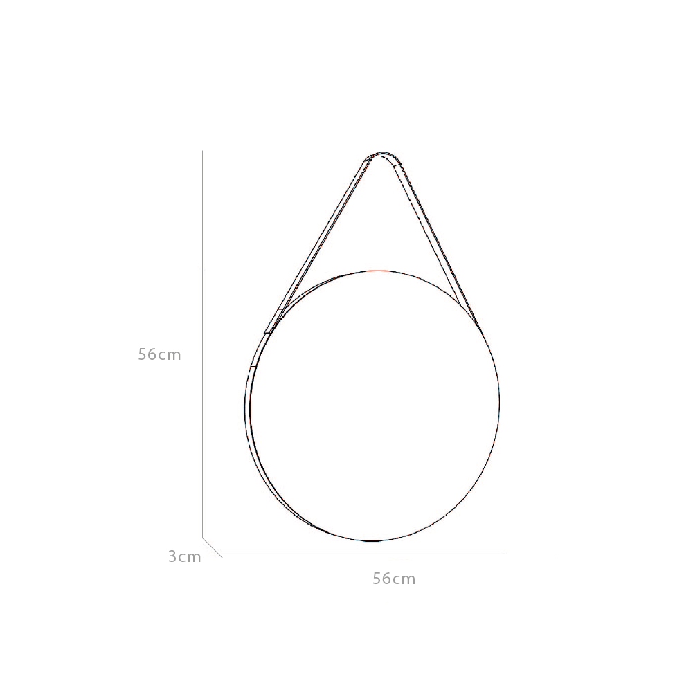 Espejo circular con marco aglomerado MDP revestido en cuero y correa decorativa en cuero, ensamble a pared con chaflan