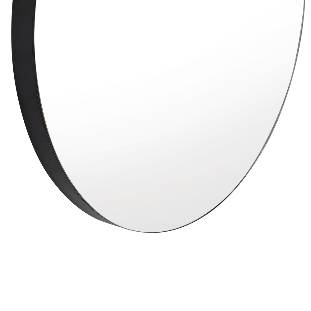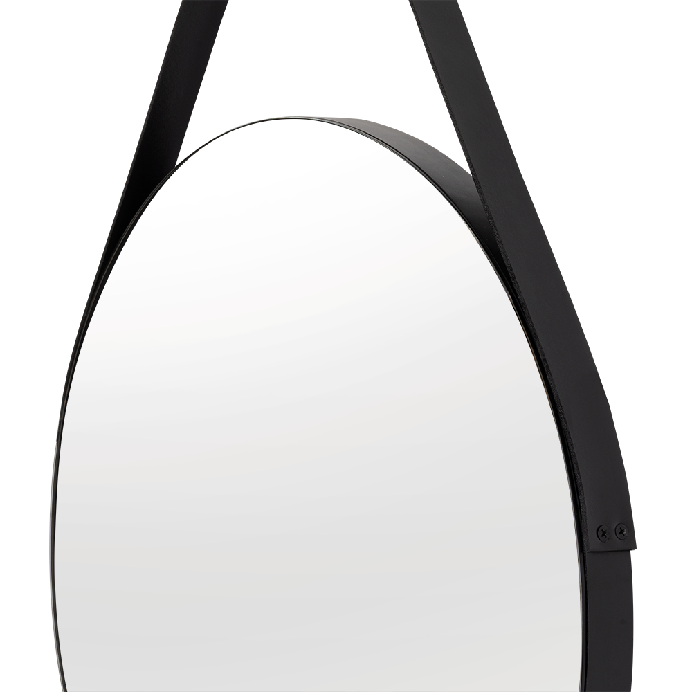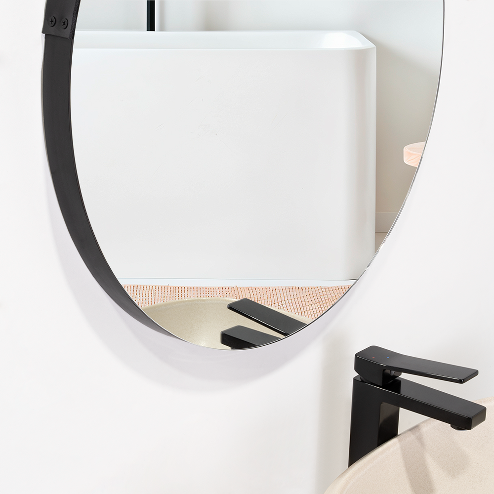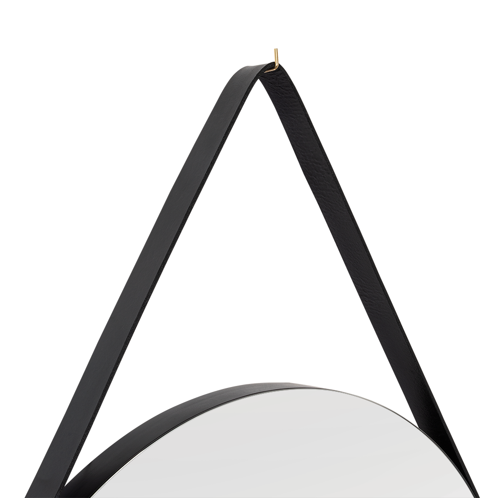 Espejo circular con marco aglomerado MDP revestido en cuero y correa decorativa en cuero, ensamble a pared con chaflan