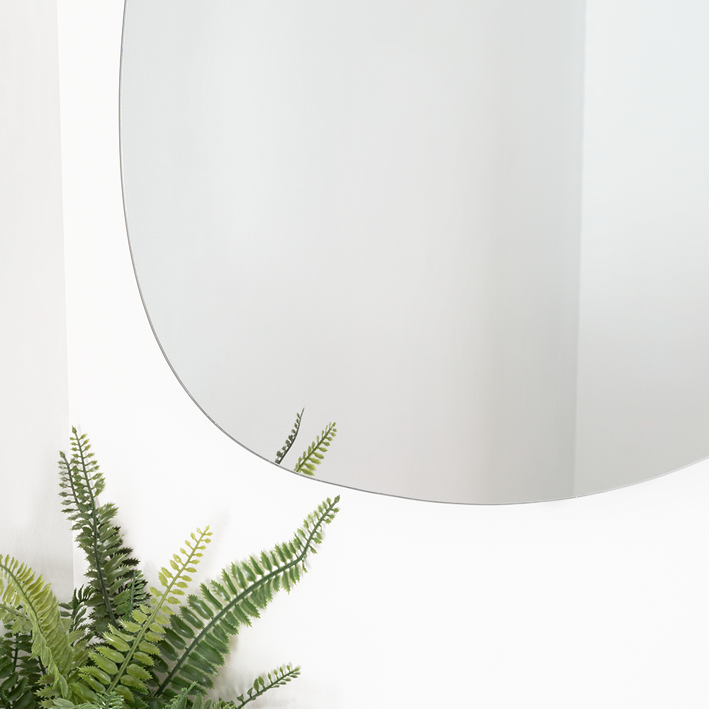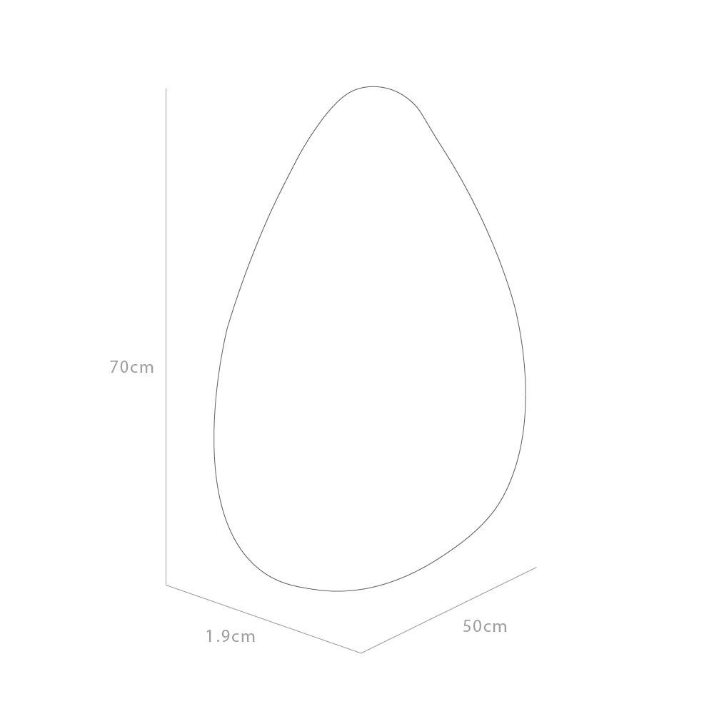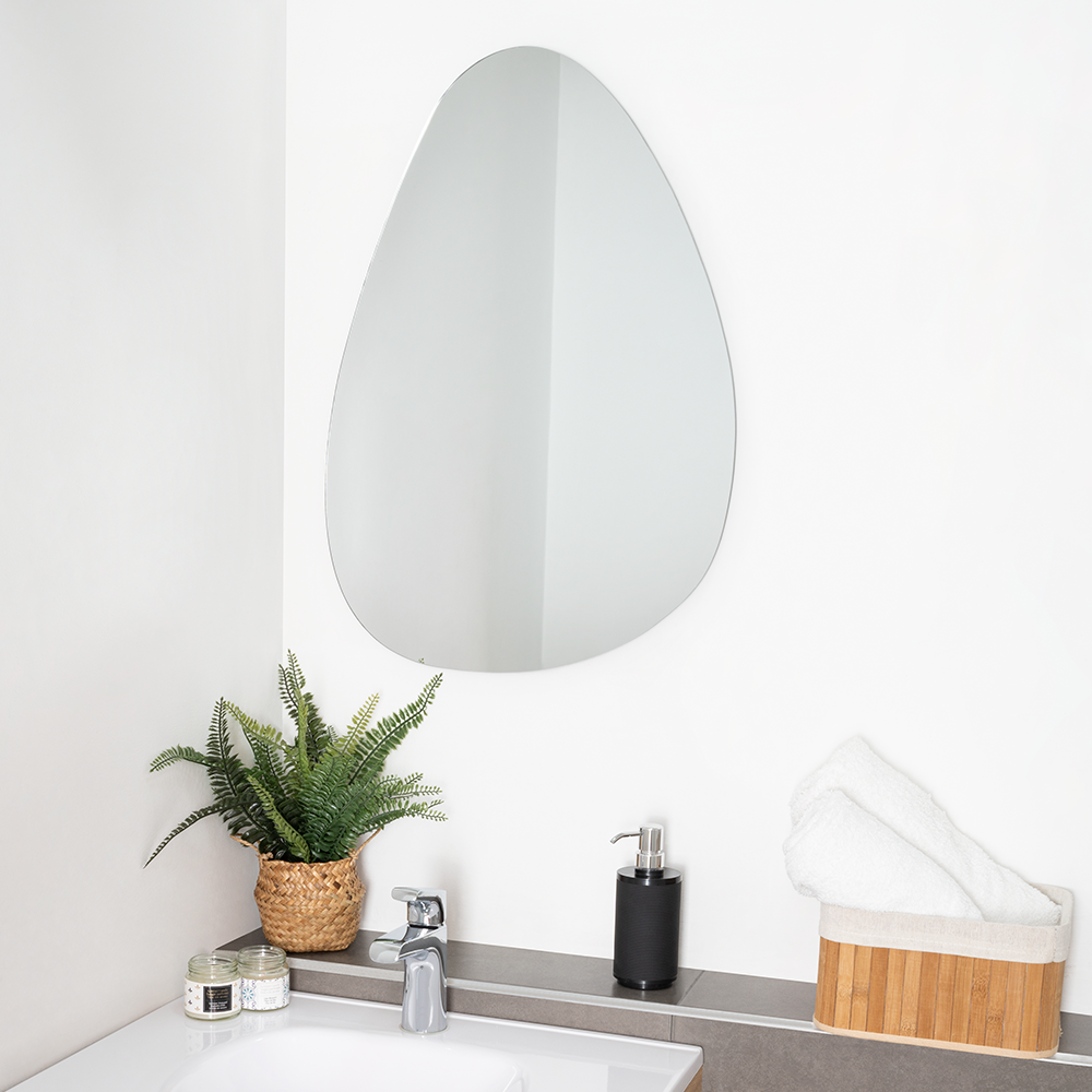 Espejo en forma de gota aporta un toque artístico y moderno a cualquier espacio, ideal para baños, entradas o rincones decorativos. Su acabado en sus bordes crea un efecto de profundidad y brillo que realza y amplía visualmente el ambiente.