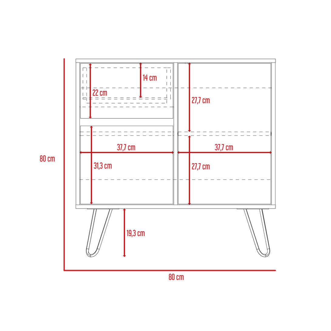 Mesa Auxiliar con espacio para colocar y almacenar objetos, dos puertas y un cajon apertura sin manija, patas metalicas negras.
