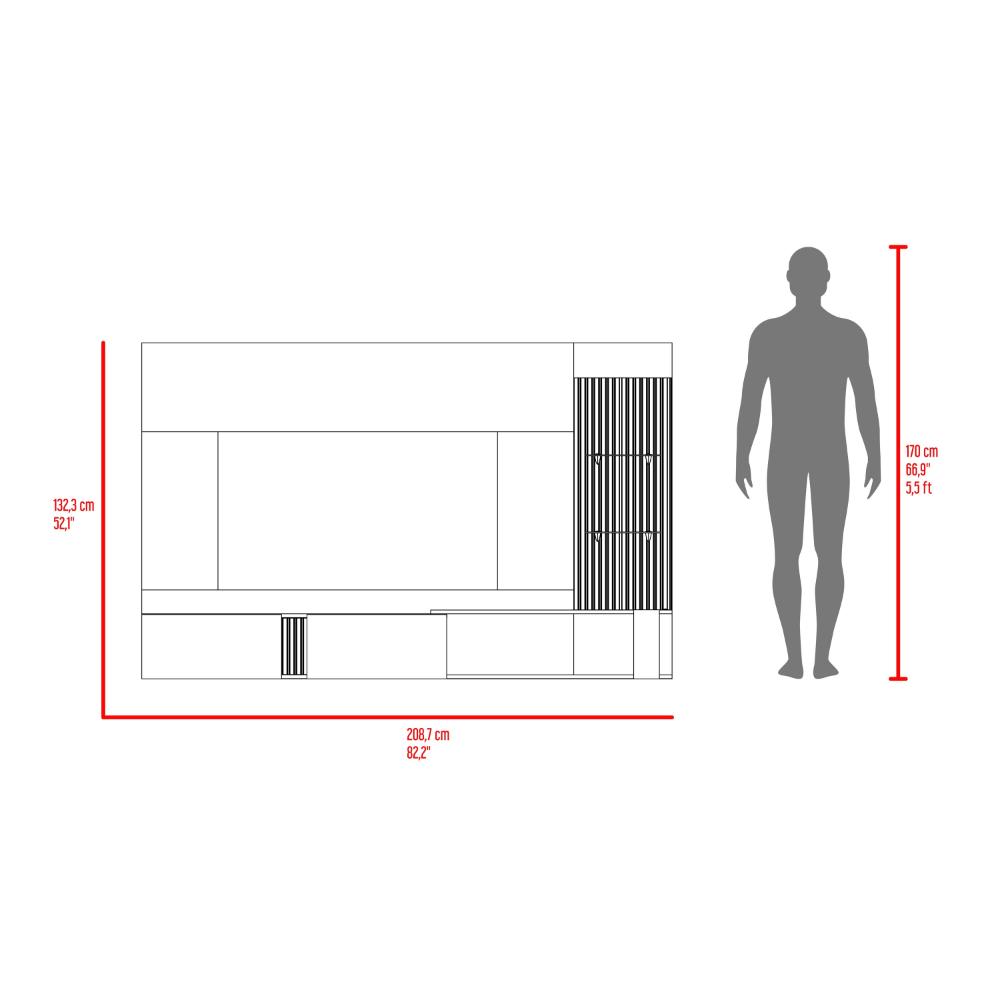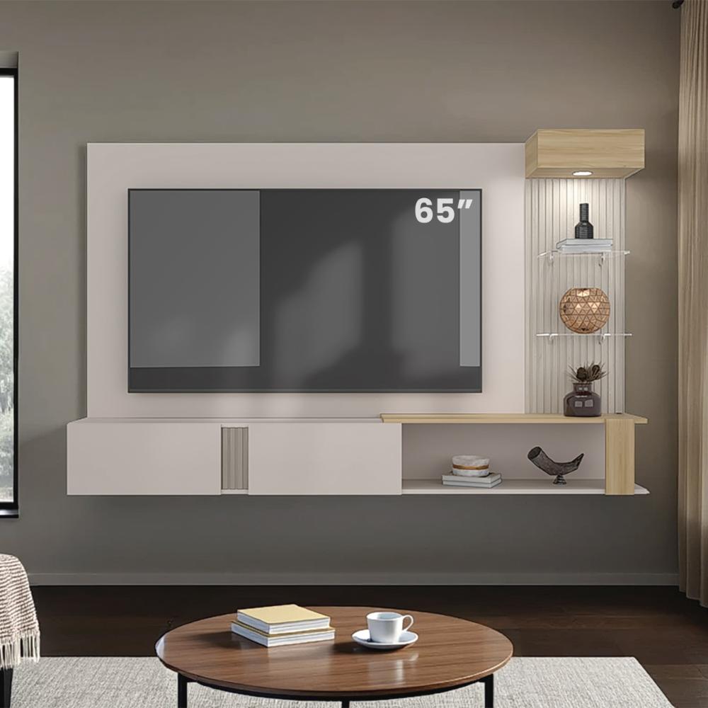 Panel de TV, con un diseño moderno y unico, con compartimento para oBjetos decorativos, audio y video, cuanta con luz led, repisas en vidrio y madera ranurada que le brinda un toque contemporaneo y atractivo, cuanta con dos puertas abatibles y capacidad paRa tv de hasta 70"