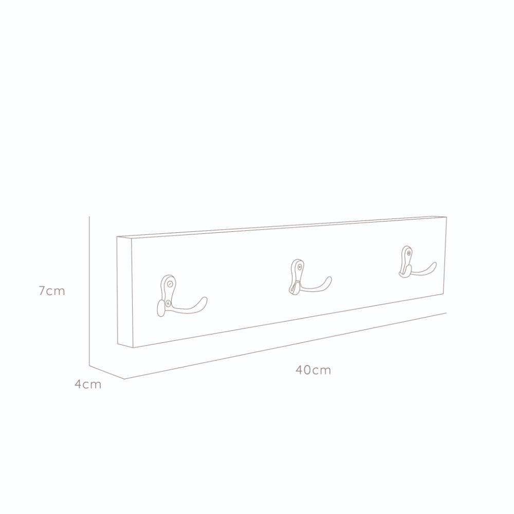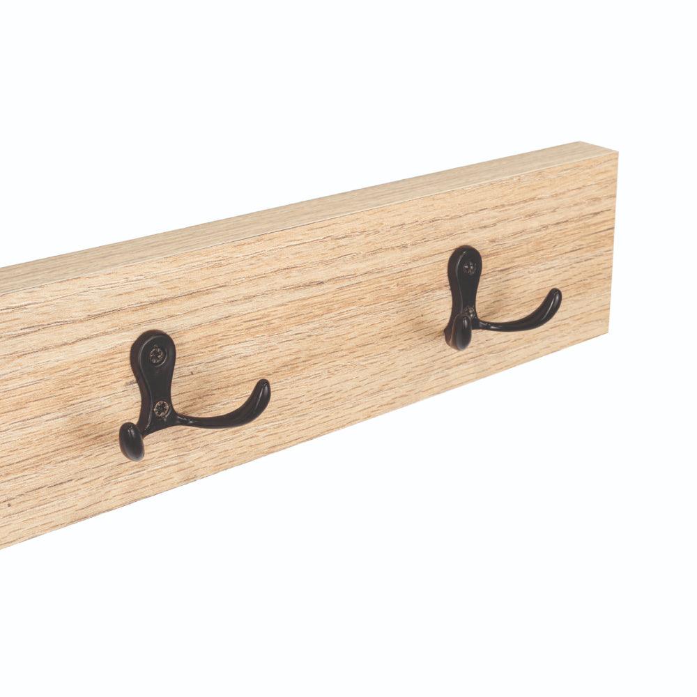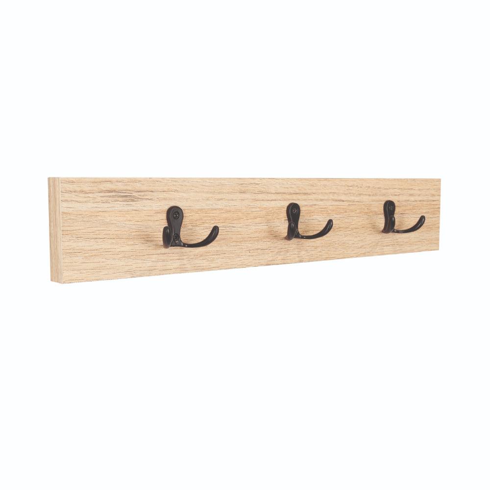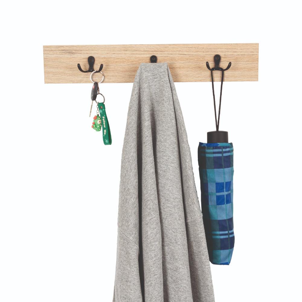 Repisa con 3 ganchos dobles color negro para colgar llaves o accesorios; no requiere armado, incluye chazos para instalación a pared.